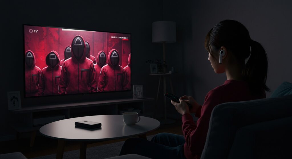 Netflixのホーム画面(じゃなくてもよさそう、どこでも可)で、リモコンのホームボタン長押し、オーディをポチッとして、AirPods Pro 2を選択したらOKでした。
