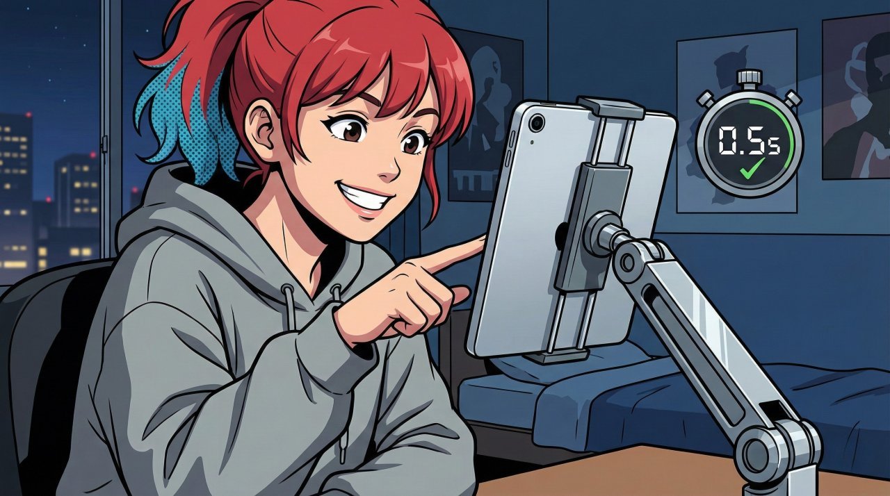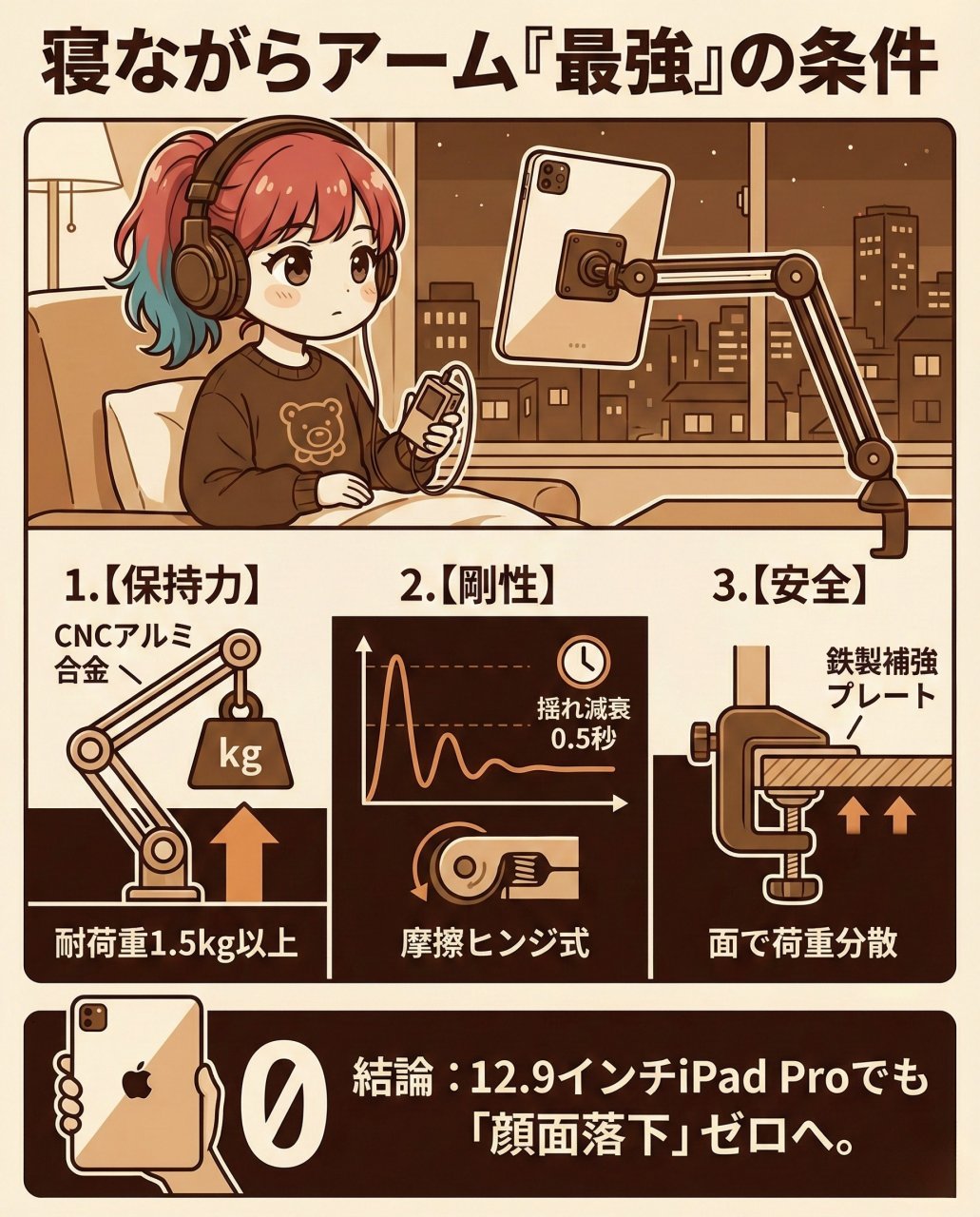 私が定義した「寝ながらアーム」の絶対条件は以下の3点です。iPad Pro 12.9インチ(約682g)に重い保護ケース(約300g)を付けると総重量は1kgに迫ります。これを支えるには、生半可なスペックでは足りません。