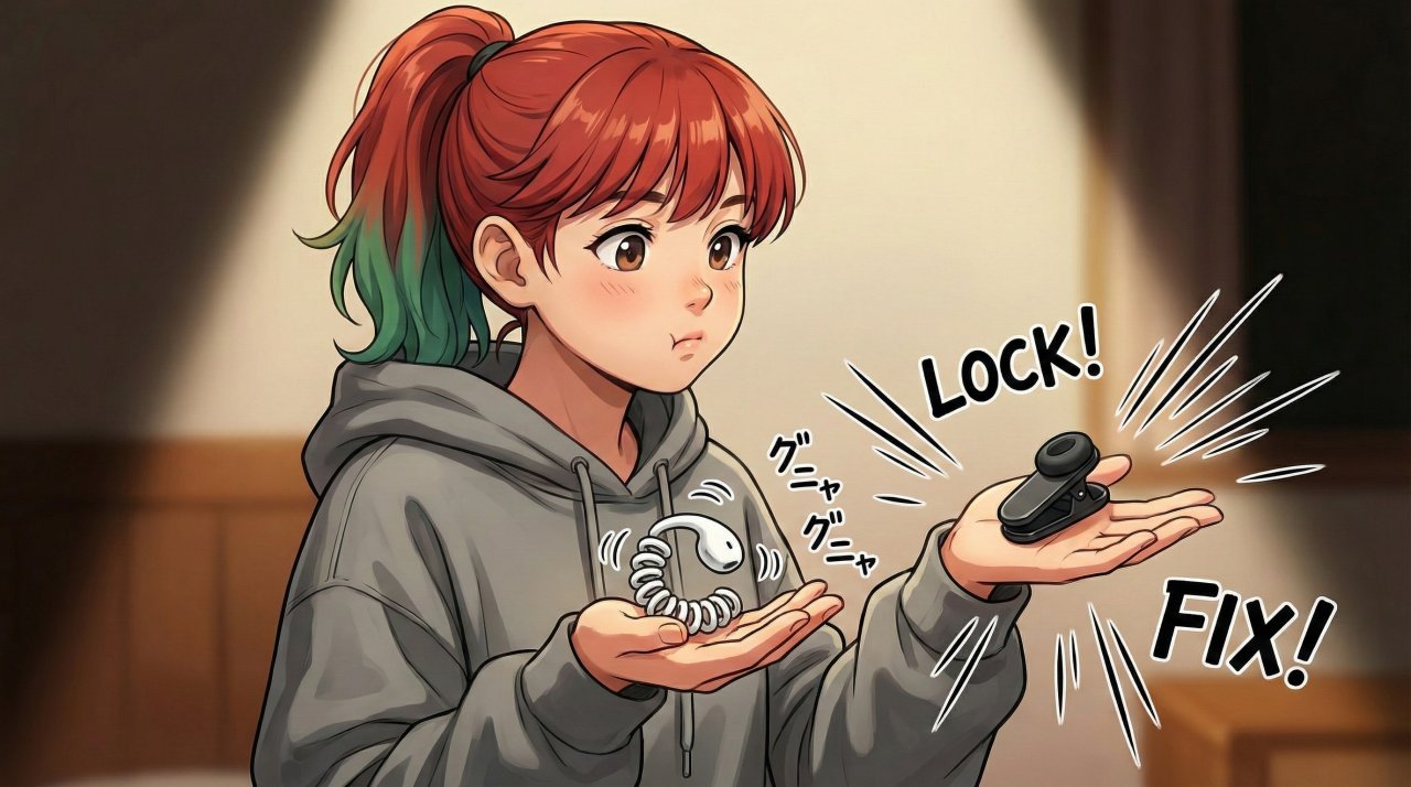 FreeClip 2の「形状記憶合金(C-bridge)」は、自動で耳の形にフィットする素晴らしい技術ですが、その柔軟さが仇となり、フードのような厚手の布地が引っかかると、スルッと抜けてしまうことがありました。